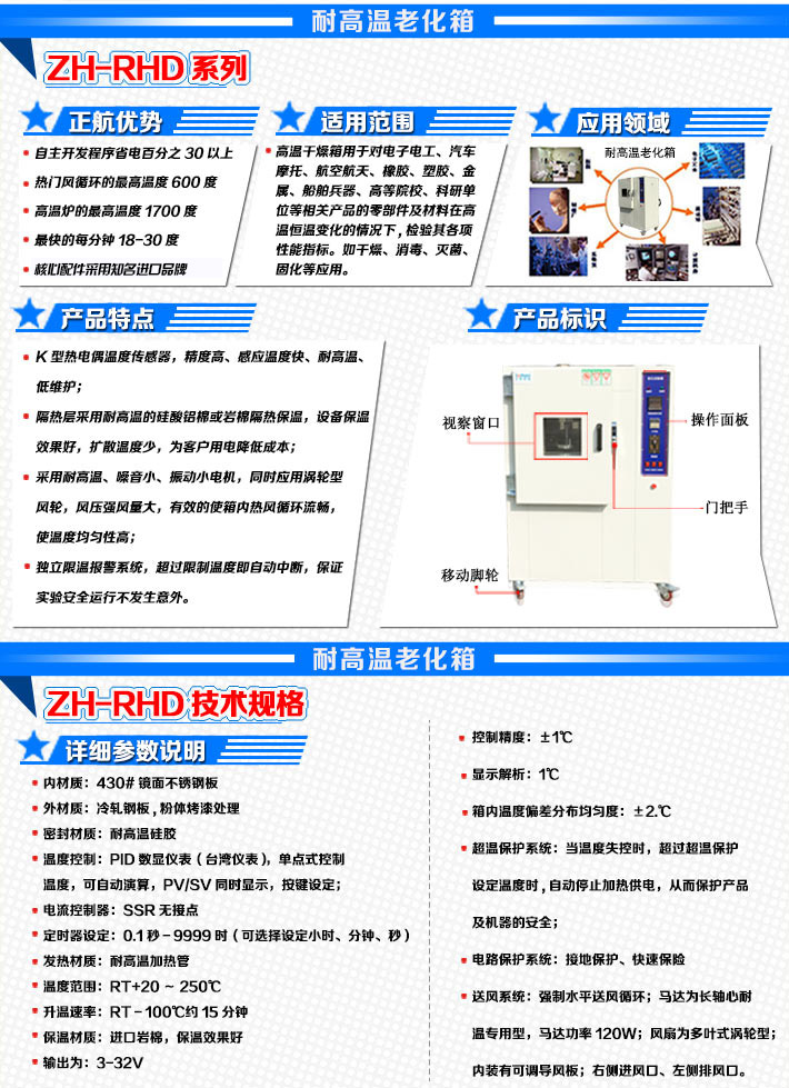 用于對(duì)電子電工、汽車摩托、航空航天、橡膠、塑膠、金屬、船舶兵器、高等院校、科研單位等相關(guān)產(chǎn)品的零部件及材料在高溫恒溫變化的情況下,檢驗(yàn)其各項(xiàng)性能指標(biāo)。嚴(yán)格按GB/T2423.2-2008高溫老化試驗(yàn)方法制造。